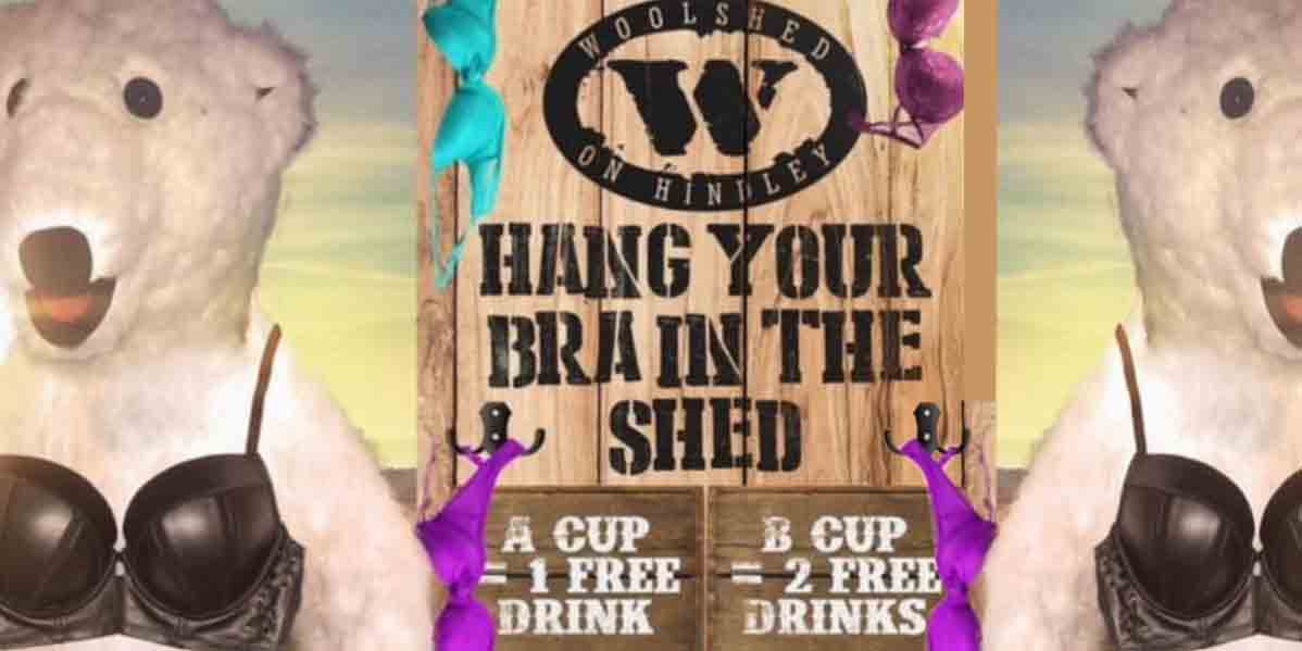 The nightclub of the Woolshed on Hindley St began promotion in June of an event dubbed ‘Hang your bra in the shed’ where girls get one, two or three free drinks upon surrendering an A, B or C-cup brassiere.